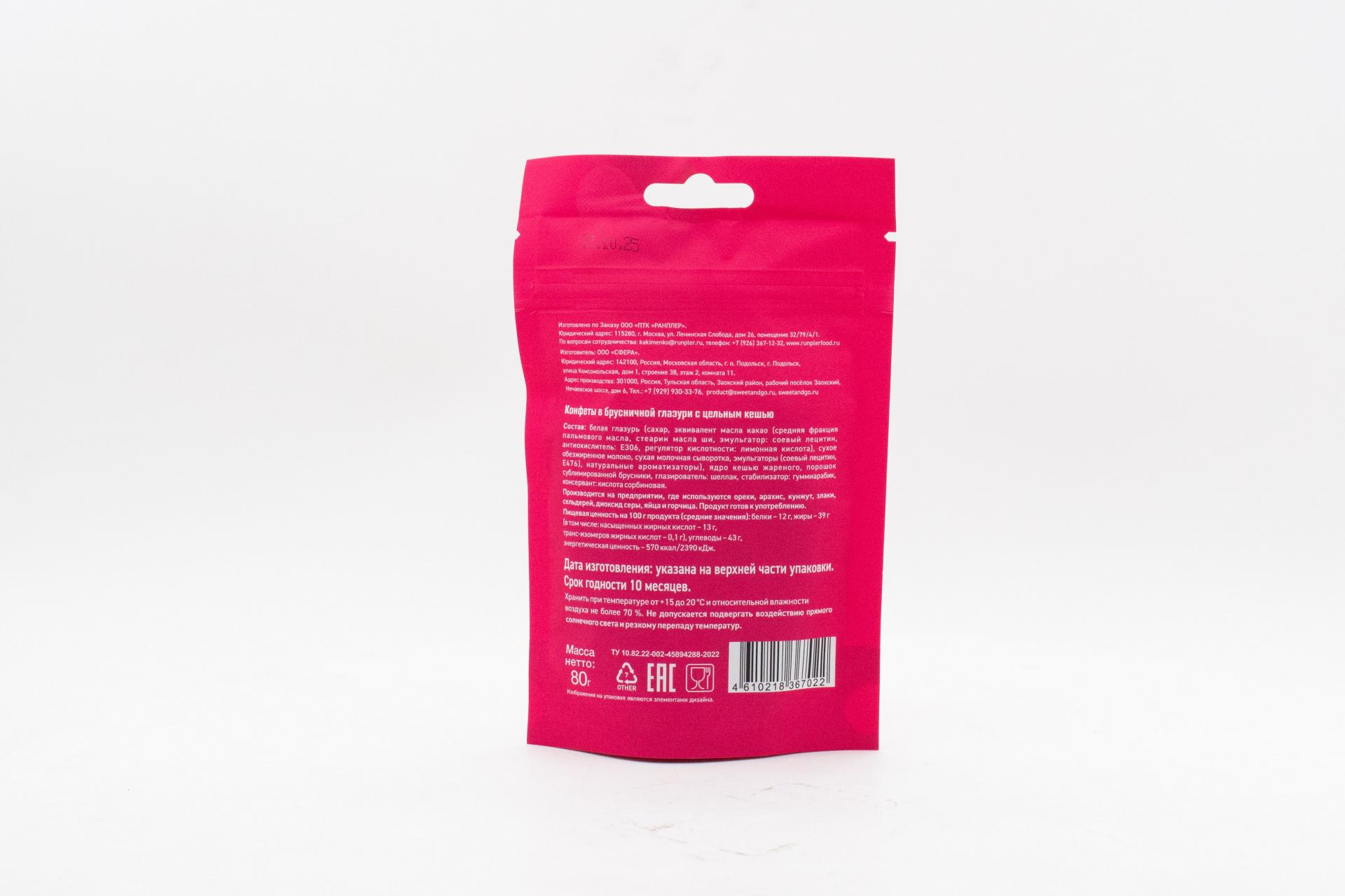Конфеты Sweet&Go в брусничной глазури с цельным кешью (Россия) 80г121,28 руб. за штуку (в упак. 15 шт.) |